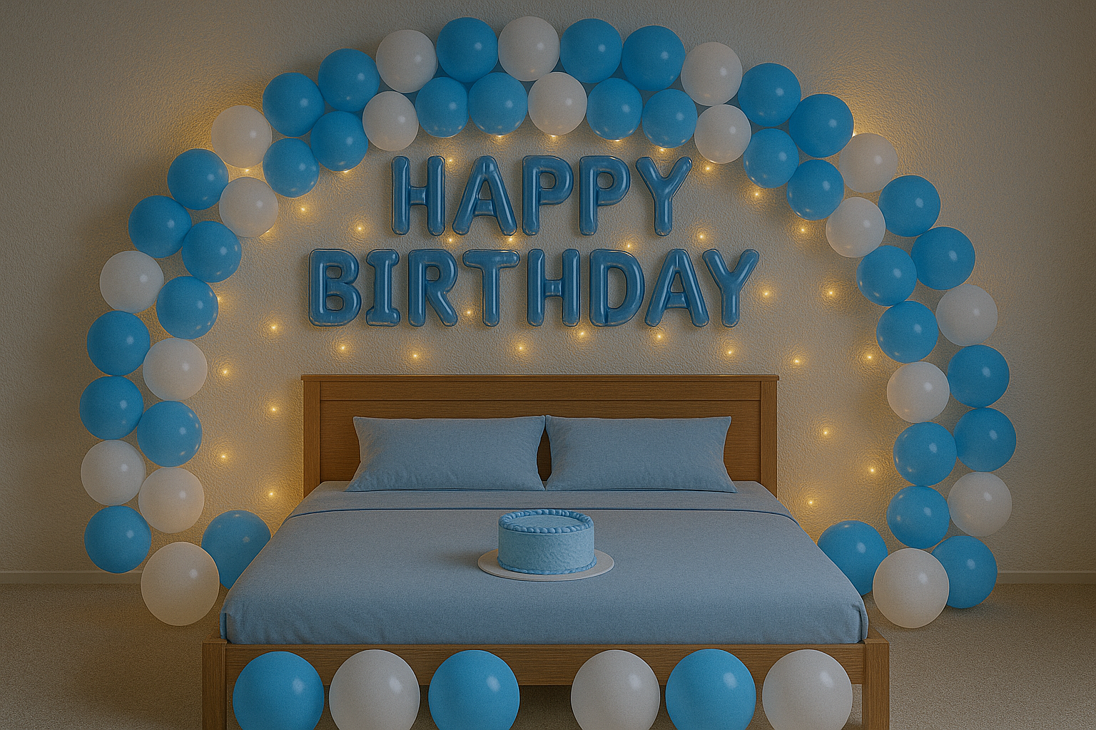 Celebrate in comfort with this cozy bedroom setup! A large bed is surrounded by blue and white balloons and gentle lights, with a sweet cake placed in the center — perfect for a dreamy, relaxed birthday surprise.