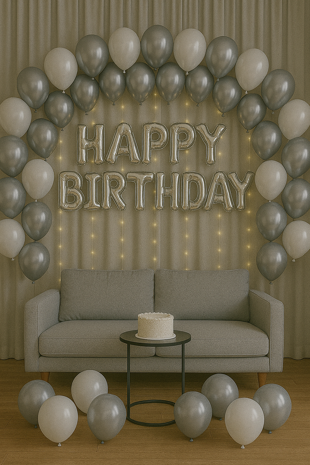Modern and classy, this silver and white setup features a plush sofa, thick wall-mounted balloons, and a soft-lit "Happy Birthday" display. Great for elegant indoor birthdays with a polished look.